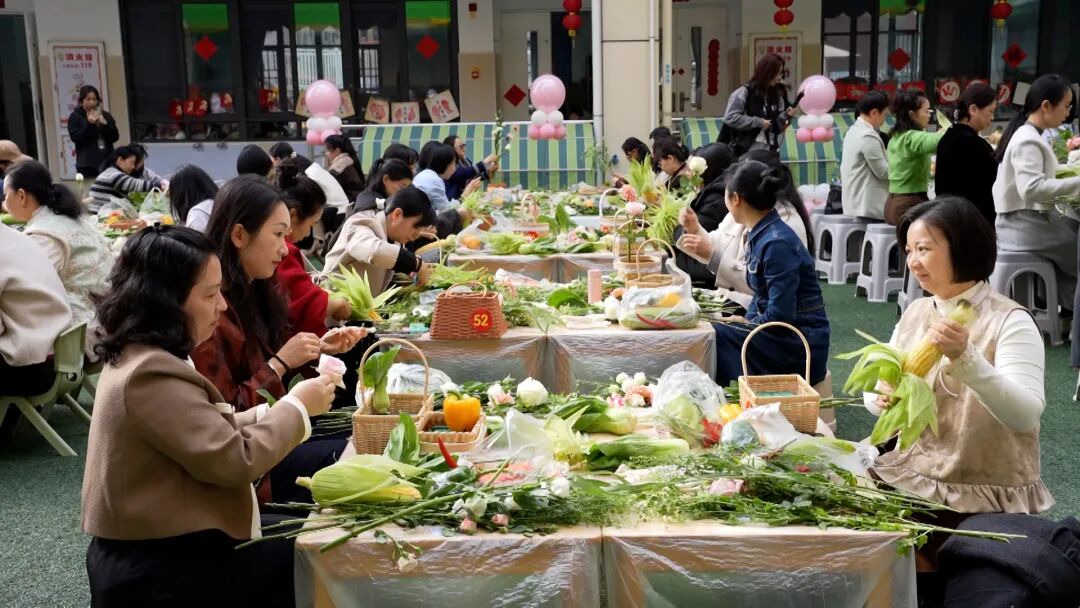 活动在轻松愉快的氛围中拉开帷幕。参赛者凝神静气,巧手翻飞,将鲜花进行巧妙的构思与搭配。她们或俯身细察,或凝神修剪,或精心布局,将个人审美与对教育的感悟融入方寸花器之中。现场气氛专注而热烈。工作人员穿梭其间,随时提供贴心的协助。