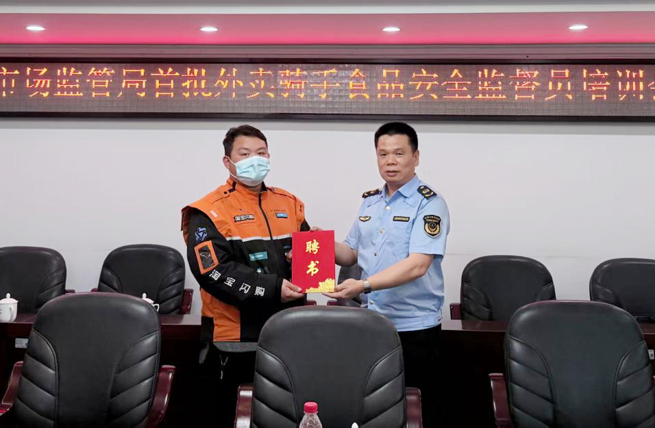 为深入推进网络餐饮食品安全专项整治工作,创新食品安全社会共治模式,切实守护人民群众“舌尖上的安全”,4月24日下午,洛江区市场监管局召开外卖骑手食品安全监督员聘任暨业务培训会。局领导、相关股室及市场监管所、平台洛江站点负责人参会,10名外卖骑手受聘为洛江区首批食品安全社会监督员。